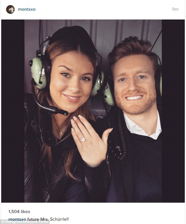 Cựu tiền đạo Chelsea Andre Schuerrle cùng bạn gái Montana Yorke khoe nhẫn đính hôn. |