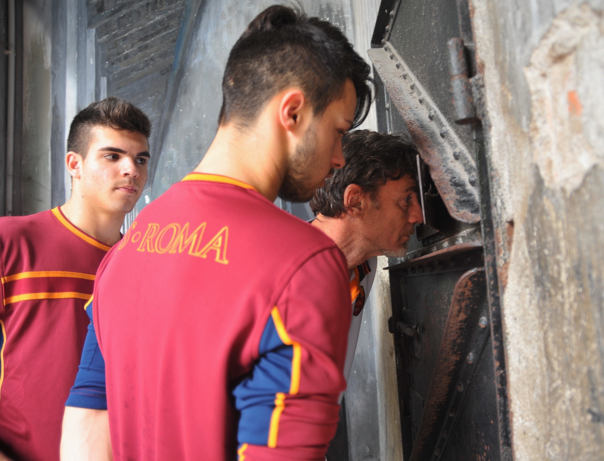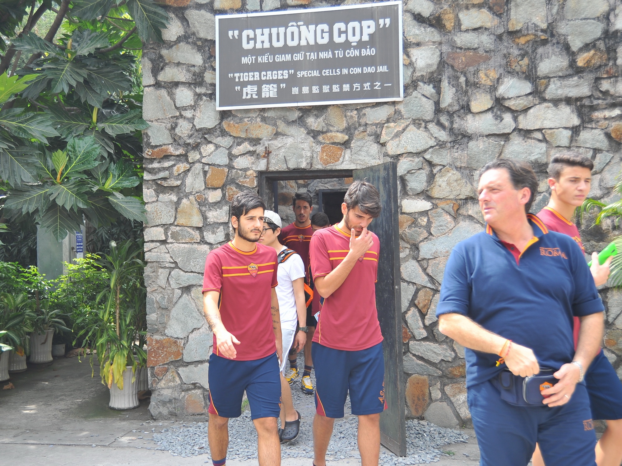 | Các cầu thủ AS Roma nhìn qua cửa sổ nhà tù mô phỏng nguyên bản ở Côn Đảo. |