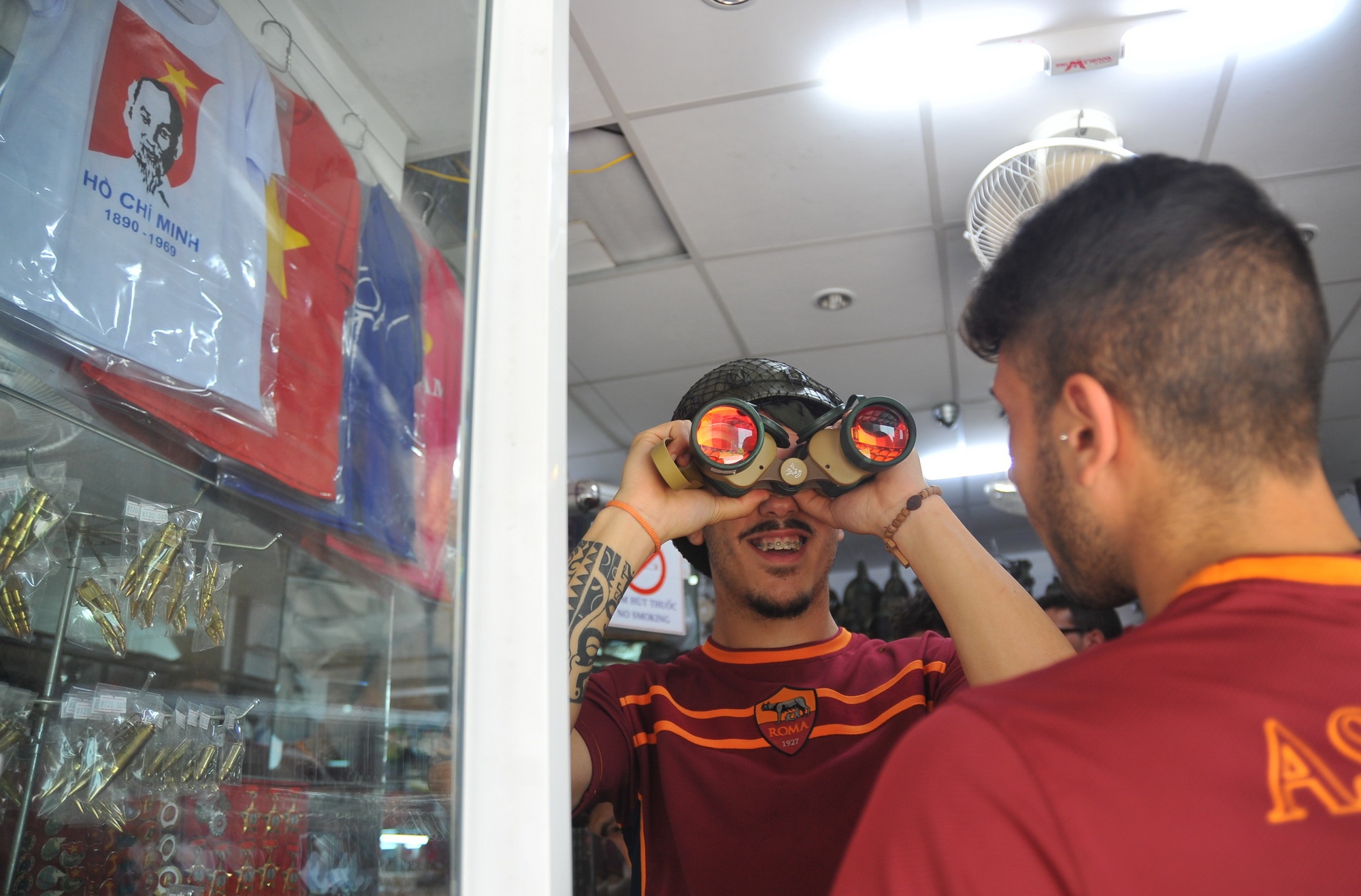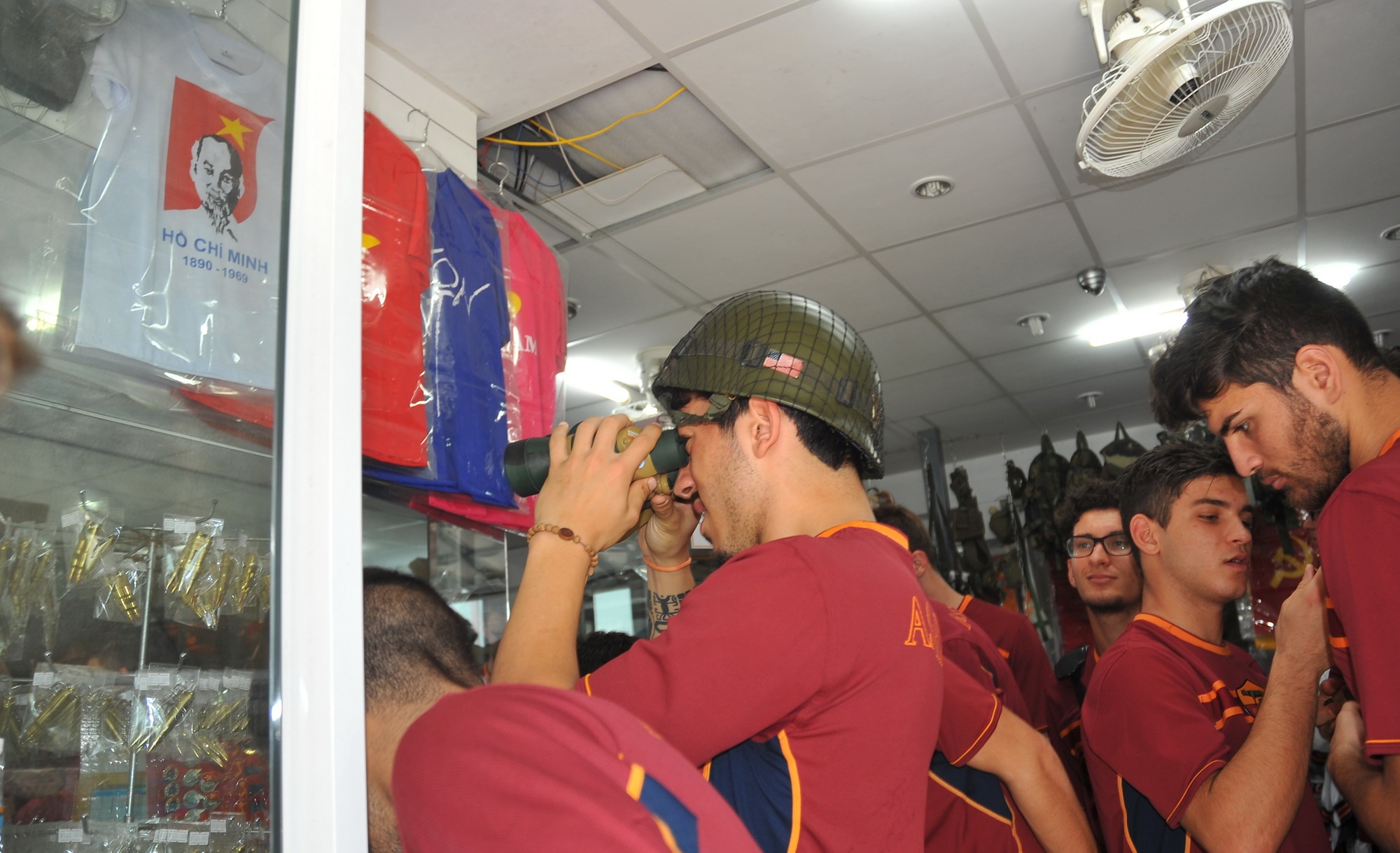 | Trước khi ra về, các cầu thủ U19 AS Roma ghé thăm gian hàng của người khuyết tật tại bảo tàng chứng tích chiến tranh Việt Nam. |