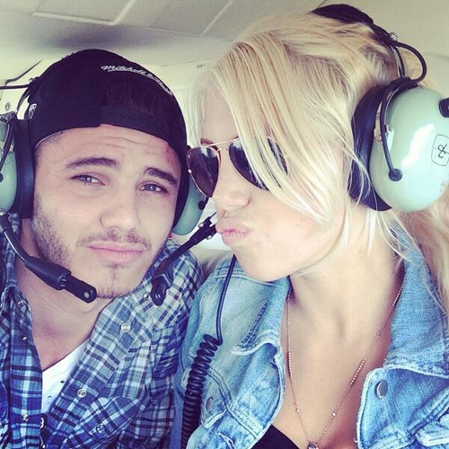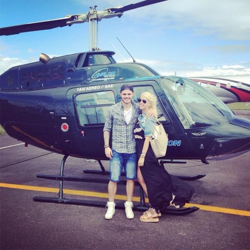 Icardi hạnh phúc chia sẻ hình ảnh lên trang Twitter. "Đang cùng một cô nàng tóc vàng trên máy bay thắng tiến tới Brazil", cầu thủ trẻ Inter Milan viết. |