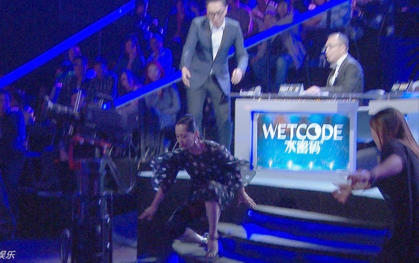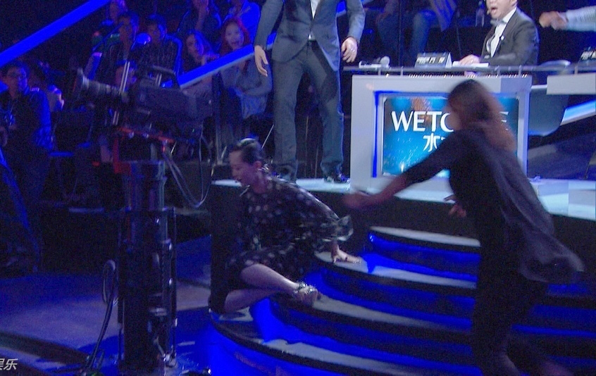 Cô được những nhân viên hậu trường giúp đỡ. Ngay cả Quách Phú Thành cũng lao khỏi ghế ngồi vì muốn đỡ nữ đồng nghiệp đứng dậy.