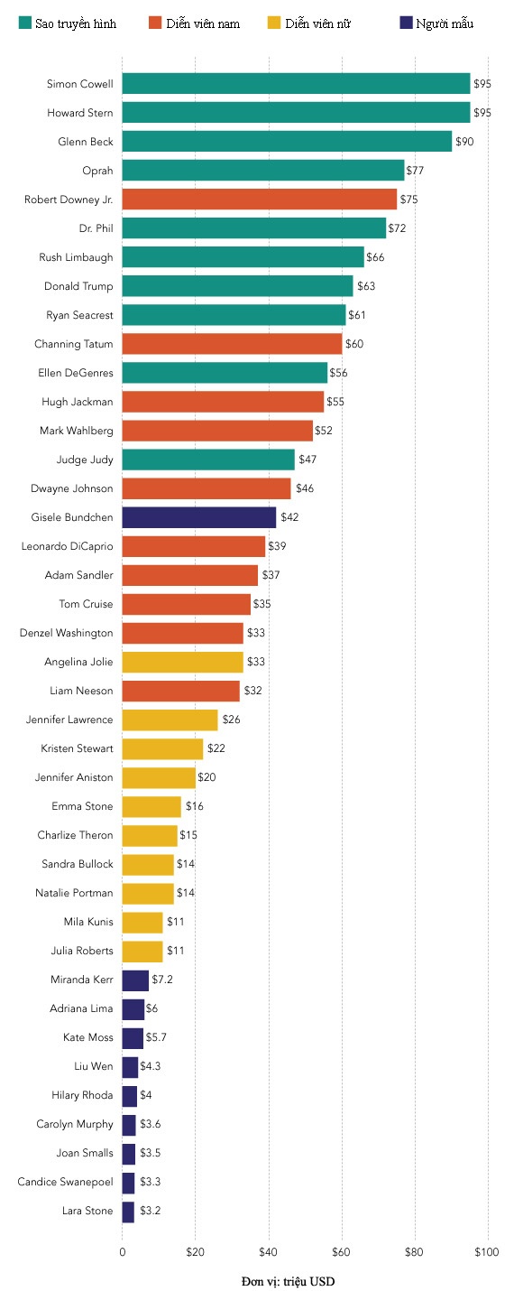 Hàng năm, Forbes luôn có một danh sách cho người hâm mộ biết thần tượng của họ đã "làm ăn" như nào trong 12 tháng qua. Tháng 7, tạp chí danh tiếng này đã hé lộ những con số mới nhất về thu nhập của sao ở 3 lĩnh vực - truyền hình, điện ảnh và người mẫu - tính từ tháng 6/2012 đến tháng 6/2013.