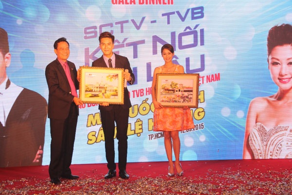 | Ông Trần Văn Úy - Tổng giám đốc truyền hình cáp SCTV trao quà lưu niệm cho hai diễn viên TVB. Cả hai diễn viên đều rất vui khi nhận những món quà lưu niệm này. |