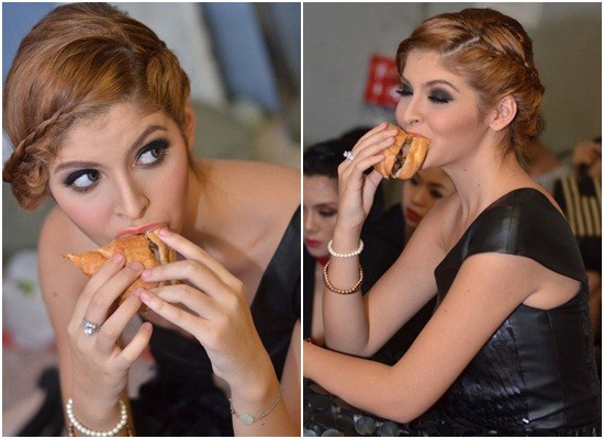 | Góp mặt trong một show diễn thời trang, hot girl Andrea Aybar đến sớm để trang điểm, làm tóc và thử đồ. Cô cũng ăn tạm bánh mì thịt trong khi chờ đến lượt mình diễn. |