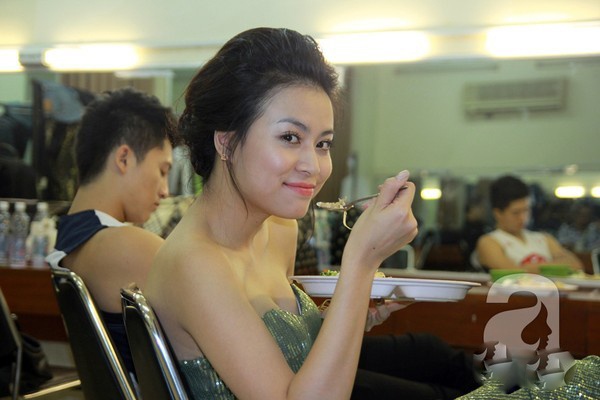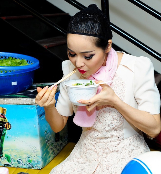 | Hình ảnh Phương Linh ăn ngon sau khi hoàn tất khâu trang điểm, làm tóc trong một đêm diễn. |