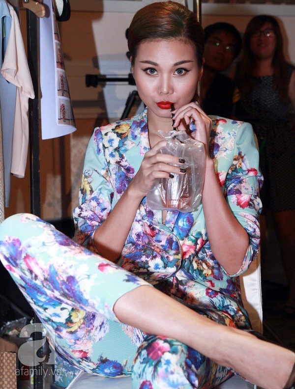 | Giám khảo chính của Fashionista Vietnam – Tín đồ thời trang Việt Nam không ngại "nạp năng lượng" khi đang được trang điểm, làm tóc. Hình ảnh bình dị của nữ hoàng giải trí khi ăn vội bữa xế được ghi lại trong hậu trường chụp hình quảng bá cho chương trình. |