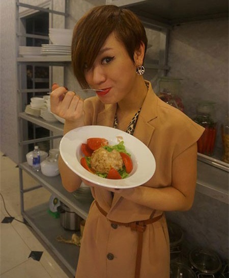 | Nữ ca sĩ Trà My Idol cũng ăn cơm trong giờ nghỉ ngơi của một show truyền hình. |