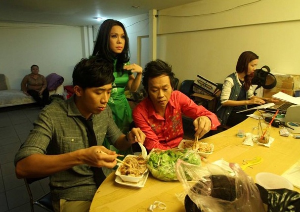 | Những cây hài như Chí Tài, Việt Hương, Trấn Thành, Hoàng Mập... tranh thủ ăn tối trước khi bắt đầu làm việc. Hoàng Mập (giữa) mang nhiều gỏi cuốn để chia sẻ với đồng nghiệp. Ai cũng đang đói nên ăn uống ngon lành. Việt Hương chia sẻ, chuyện ăn uống qua loa ở hậu trường là bình thường đối với nghệ sĩ. Dù vậy, không ai thấy mệt mà rất vui vì tình cảm ấm áp mọi người dành cho nhau. |