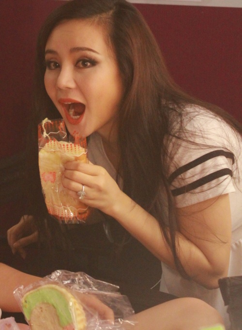 | Nữ ca sĩ Phương Thanh cũng ăn bánh mì lót dạ trước khi hát. Tuy vậy, cô vẫn rất tươi tắn khi ống kính máy ảnh hướng về phía mình. |