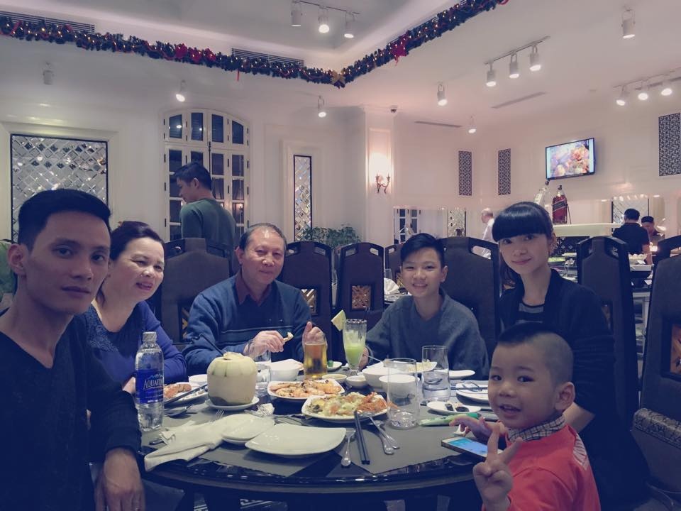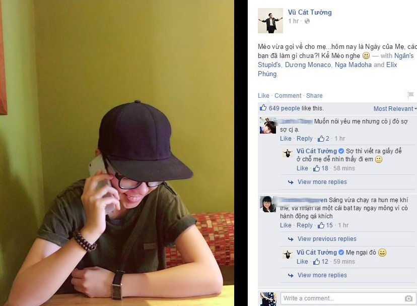 | Vũ Cát Tường dành thời gian để gọi điện chúc mừng đấng sinh thành. |