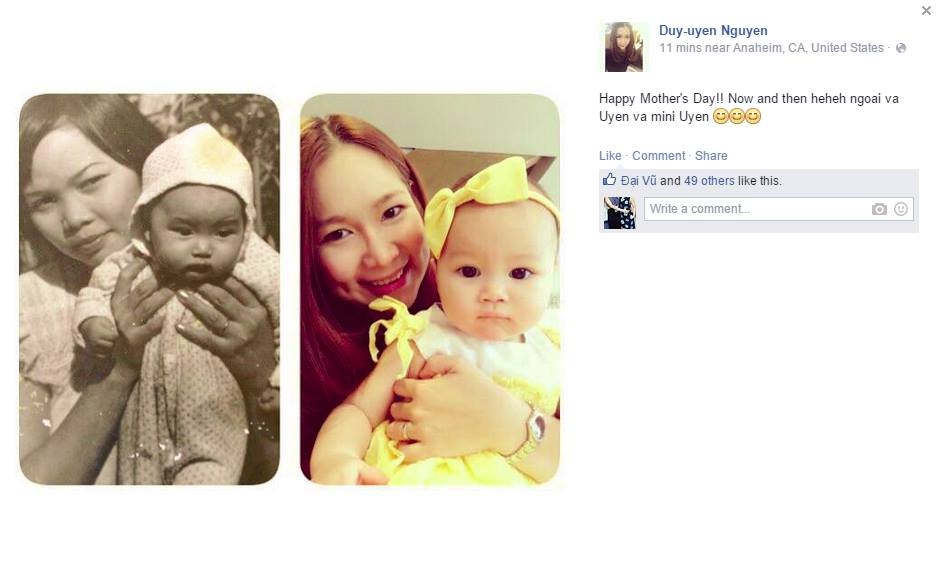| Từ Mỹ, ca sĩ Duy Uyên - cựu thành viên nhóm Mắt Ngọc - gửi lời chúc tới người mẹ đáng kính. Tháng 7/2014, nữ ca sĩ sinh hạ công chúa đầu lòng. Kể từ khi làm mẹ, Duy Uyên càng thấu hiểu hơn những vất vả mà mẹ cô phải chịu trong suốt thời gian mang thai và chăm sóc đứa bé. Dù vậy, cô thừa nhận, không hạnh phúc nào bằng được làm mẹ. |