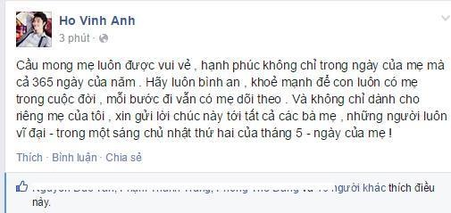 Người mẫu - ca sĩ Hồ Vinh Anh gửi lời yêu thương tới mẹ của anh và mong rằng bà sẽ luôn hạnh phúc trong suốt 365 ngày.