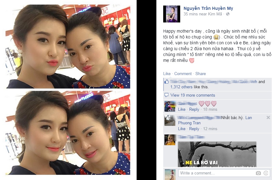 Á hậu Nguyễn Trần Huyền My đăng tải ảnh chụp cùng mẹ kèm lời chúc: "Happy mother's day, cũng là ngày sinh nhật bố. Chúc bố mẹ nhiều sức khỏe, vạn sự bình yên bên con và em Be, càng ngày càng yêu chiều hai đứa hơn nữa". Mẹ của Huyền My hiện làm trong ngành thẩm mỹ và thường đồng hành cùng con gái trong một số sự kiện.