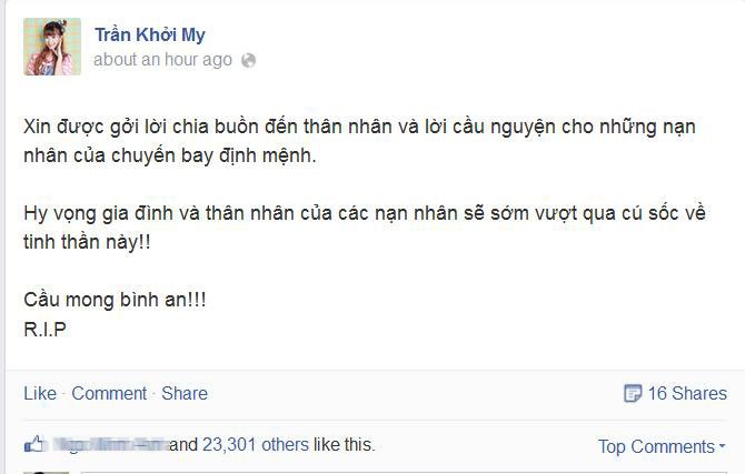| Khởi My chia buồn cùng các nạn nhân của vụ máy bay MH 17 bị bắn rơi trên không phận Ukraina. |