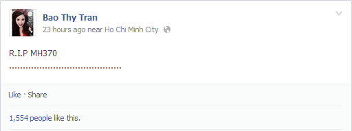 Trong hai tuần qua, sự kiện thu hút chú ý nhất trên thế giới là sự mất tích của máy bay MH370. Tối 24/3, Thủ tướng Malaysia thông báo phi cơ Boeing 777 lao xuống biển và tất cả mọi người trên chuyến bay MH370 đều thiệt mạng. Sau khi thông tin này được công bố, rất nhiều cư dân mạng đã bày tỏ sự tiếc thương với số phận những người đi trên chuyến bay. Trong suốt 17 ngày tìm kiếm, không ít người vẫn hi vọng vào một kết cục khả quan hơn.