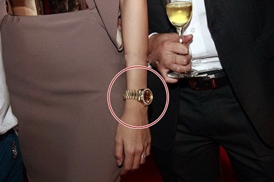 Ngay khi xuất hiện tạo sự kiện, cô lập tức thu hút mọi người bởi trên tay đeo chiếc đồng hồ màu vàng, kiểu rắn xoắn bảy vòng. Đây cũng là chiếc đồng hồ được mọi người bàn tán xôn xao về hình dáng cũng như giá trị thực sự của nó trong suốt một thời gian, người cho rằng đó không phải là món quà Công Vinh tặng cho cô nàng, người lại kháo nhau giá trị của nó không đến 4 tỷ đồng.