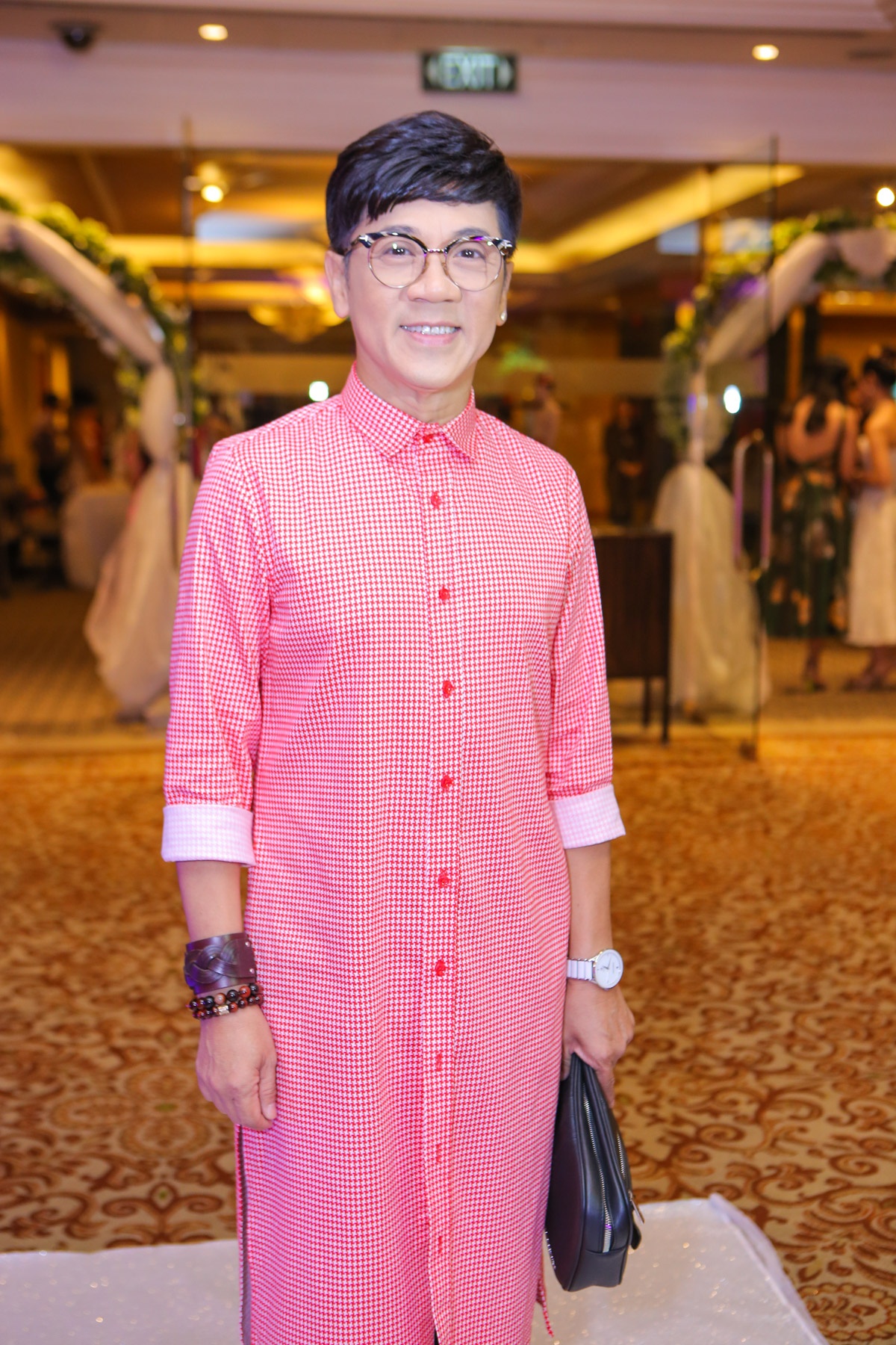 | Nghệ sĩ Thành Lộc diện áo dài cách tân hiện đại, một mình tham dự tiệc mừng của đôi trẻ. |