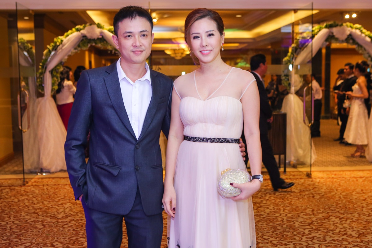| Huỳnh Đông đưa bà xã Ái Châu đến chúc mừng hạnh phúc đồng nghiệp. Cả hai vận trang phục đơn giản, lịch sự. |