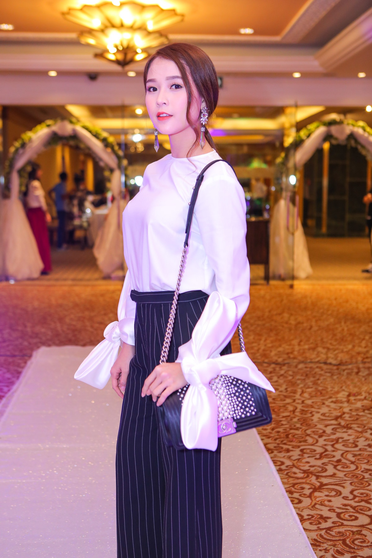 | Hot girl Sam trong bộ cánh áo sơ-mi cách điệu và quần sọc kẻ đến dự hôn lễ của đàn chị. |