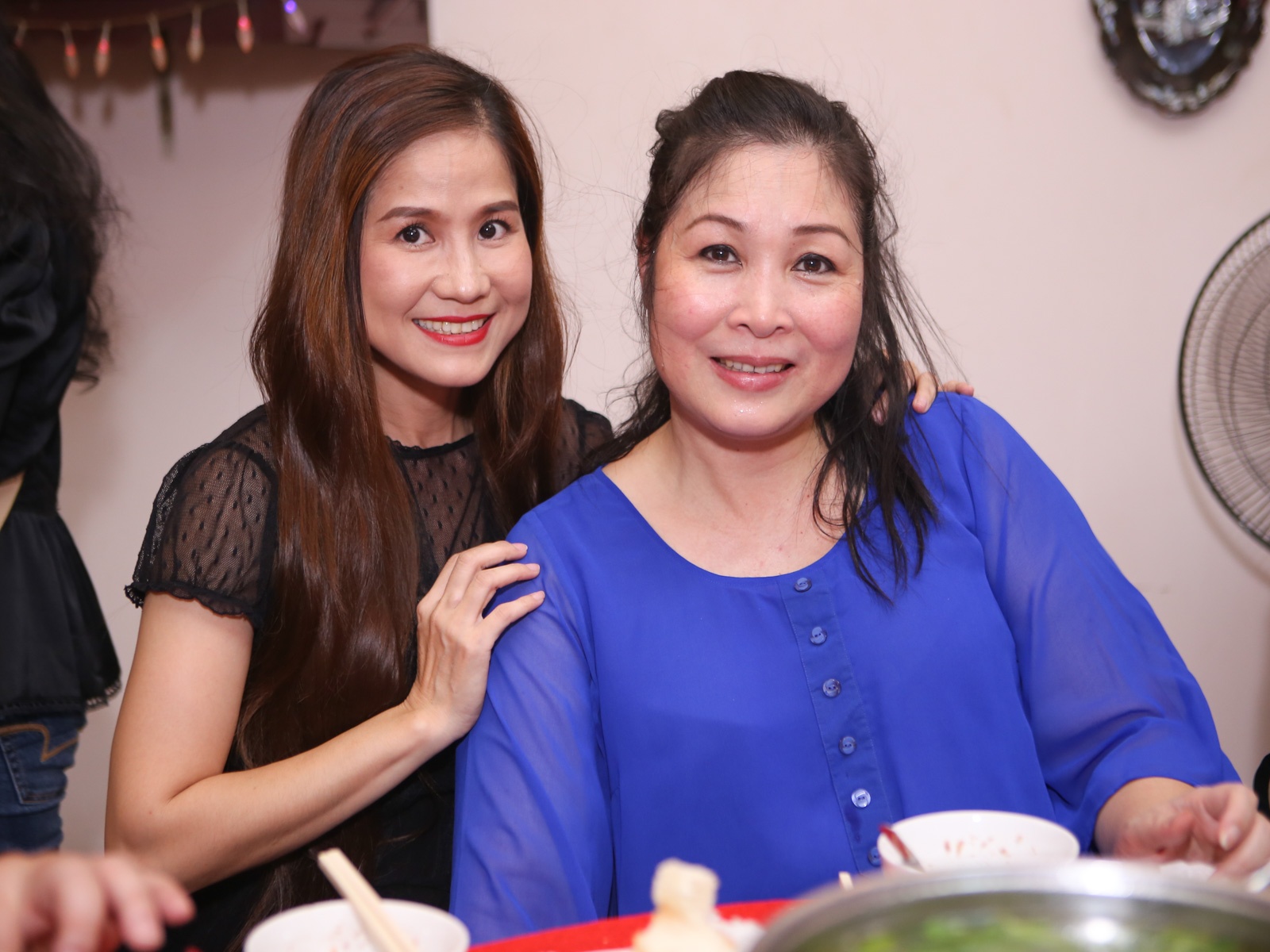 Nữ diễn viên Vân Anh chụp ảnh cùng NSND Hồng Vân trong bàn tiệc. |