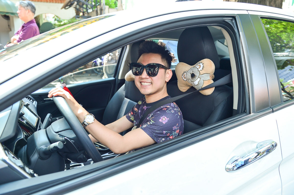 Don Nguyễn lái xe đến sân khấu. Sau khi nổi tiếng trên mạng, anh được nghệ sĩ Thành Lộc mời về và giao những vai vui nhộn. |