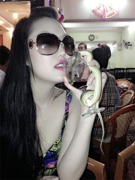 "Nữ hoàng dao kéo" Phi Thanh Vân không ngại uống rượu cùng một con rắn. |