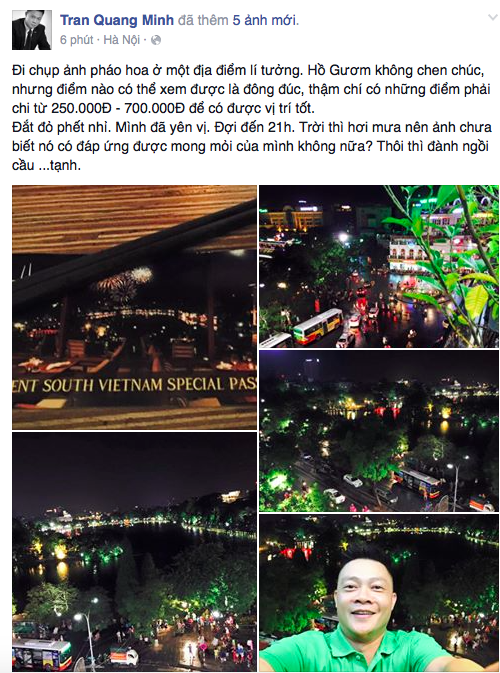 | Năm nay, vì bận rộn với công việc tại nhà đài, Quang Minh không hộ tống bà xã và các con đi du lịch. Vì thế, người dẫn chương trình Chúng tôi là chiến sĩ đã rủ người hâm mộ cùng đi xem pháo hoa và chụp ảnh tại Hồ Gươm. Tuy nhiên, vì điều kiện thời tiết và góc máy, BTV chưa thực sự hài lòng khi không săn được những bức ảnh pháo hoa đắt giá. |