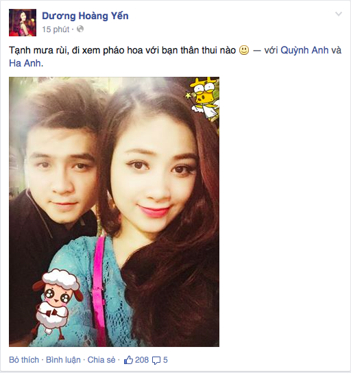 | Nữ ca sĩ Dương Hoàng Yến cũng đi xem pháo hoa cùng với bạn trai Hà Anh. Trước đó, trời Hà Nội có mưa, tuy nhiên, điều này không làm ảnh hưởng tới tinh thần háo hức của các nghệ sĩ. May mắn, đến cận giờ bắn pháo hoa, thời tiết đã tạnh ráo.