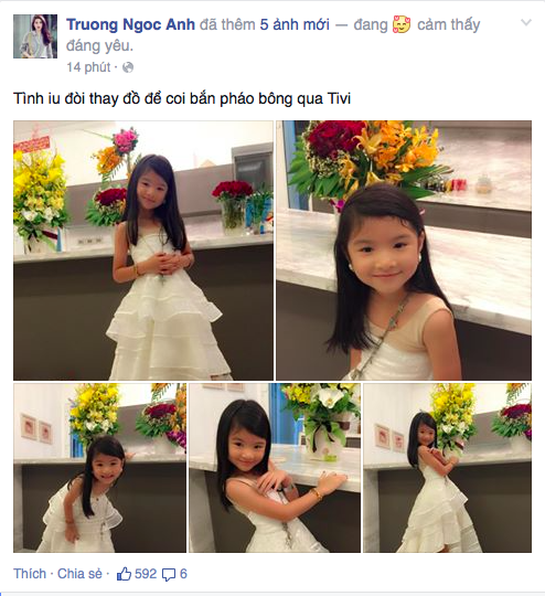 | Trong khi đó, mẹ con người đẹp Trương Ngọc Ánh lại cùng nhau xem pháo hoa qua màn ảnh nhỏ. Nữ diễn viên Hương Ga chia sẻ, công chúa đầu lòng đòi thay trang phục mới để cùng mẹ đón khoảnh khắc đẹp. |