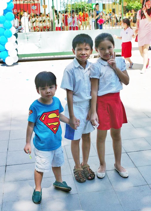 Trên trang cá nhân, Trần Lực chia sẻ niềm vui của người bố chứng kiến khoảnh khắc các con đến trường ngày khai giảng. Anh viết: "Hôm nay cả nhà cháu dậy sớm, hình như là 5h30 chuông đổ. Đúng 7h cả nhà có mặt ở trường". Trong ảnh, Trần Bờm và chị gái được cậu út tiễn trước cổng trường. Ảnh: FBVN