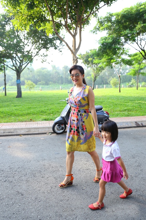 Ngày đầu của niên học mới, cô nhóc 4 tuổi tỏ ra khá bẽn lẽn, không muốn rời xa mẹ. Cựu người mẫu cưng chiều bế bé Thỏ suốt buổi khai giảng. Nhóc tỳ được mẹ sắm váy mới xinh xắn. Ảnh: FBVN