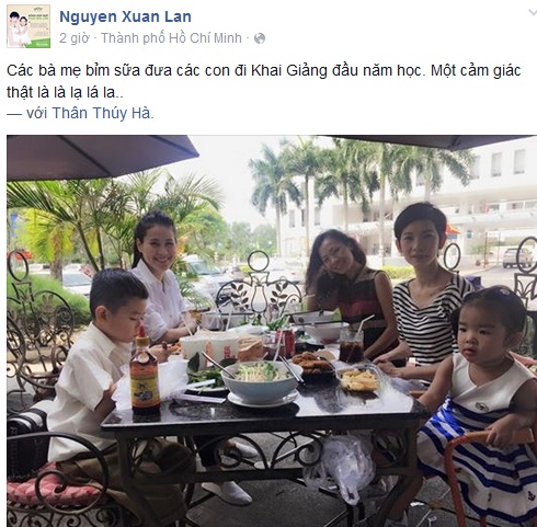 Xuân Lan và bé Thỏ cùng bữa sáng cùng mẹ con Thân Thúy Hà trước khi đưa hai thiên thần đến trường dự lễ khai giảng. Ảnh: FBVN