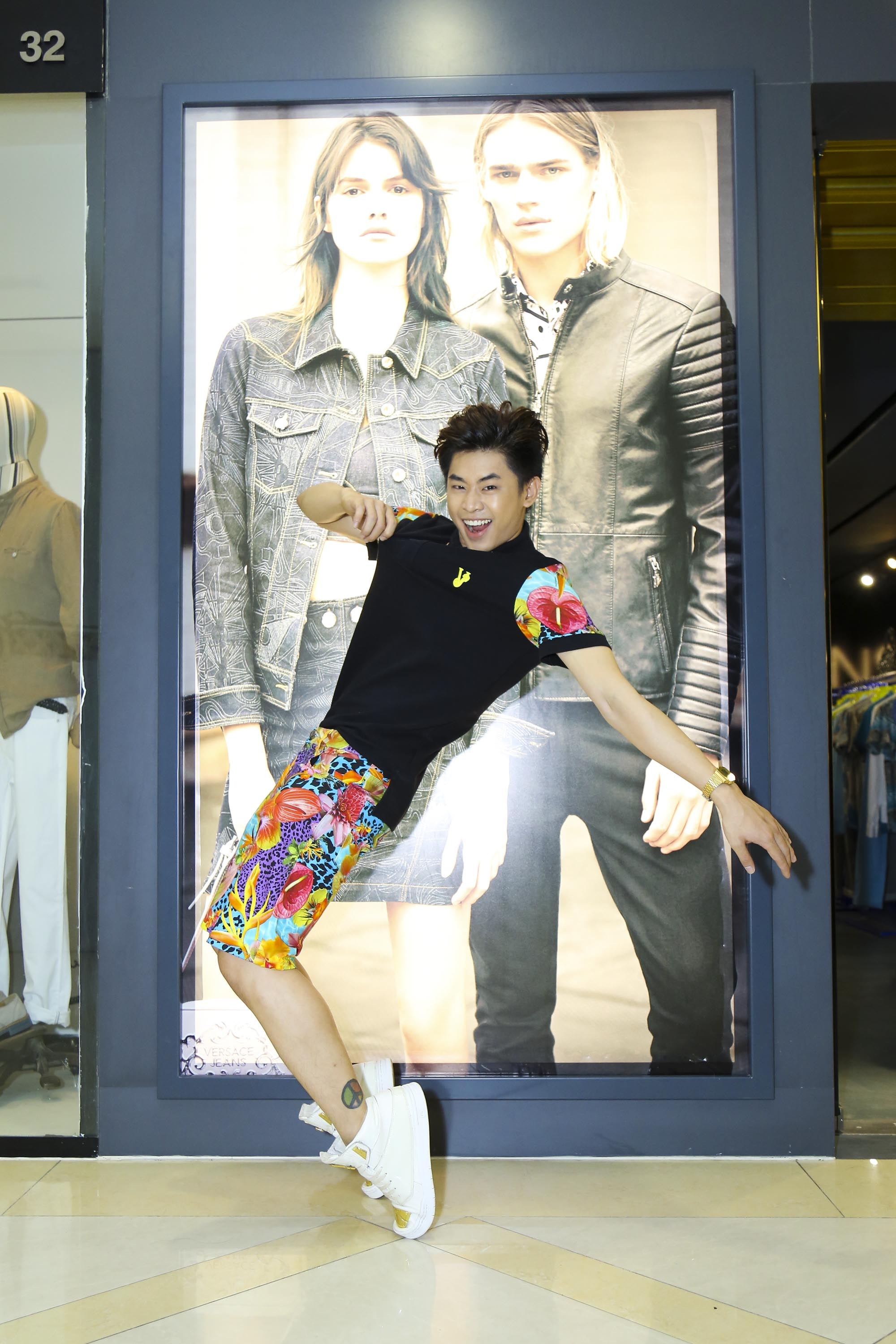 | Người mẫu Quang Đại chọn sơ mi cộc tay họa tiết phối cùng quần jeans đen dáng ôm. |