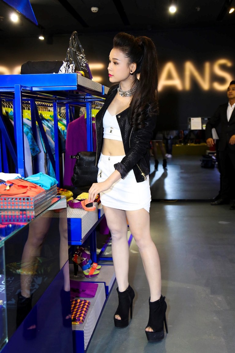 Đến dự buổi giới thiệu BST xuân hè của Versace Jeans diễn ra vào ngày 16/5 vừa qua, ca sĩ trẻ Tóc Tiên như thiêu đốt mọi ánh nhìn khi xuất hiện trong bộ trang phục denim toàn tập khoe dáng chuẩn đồng hồ cát và mái tóc dài cột cao khác lạ. Vóc dáng của cô được nhấn mạnh bởi cây denim gồm áo lửng (crop-top) và quần jeans dáng ôm của Versace Jeans. Cô chọn túi xách cầm tay và boots lửng hở mũi bằng da màu đen có những chi tiết kim loại điểm xuyết.