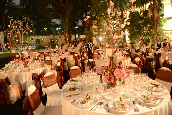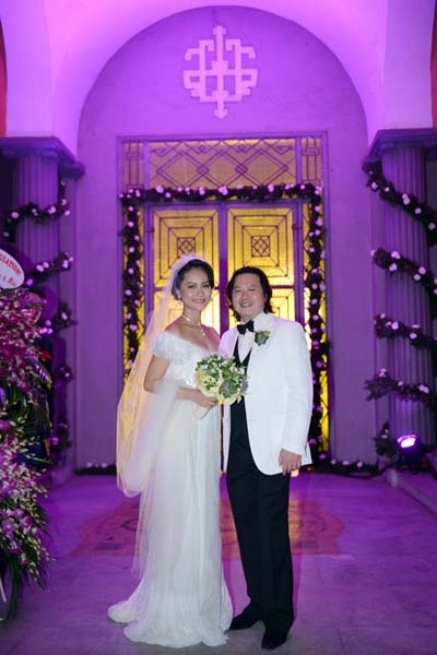 | Đôi uyên ương cũng chọn tổ chức đám cưới tại một trung tâm tiệc cưới hàng đầu ở TP.HCM là White Palace. Gia đình nhà trai đã bao toàn bộ khu sảnh của Trung tâm hội nghị White Palace làm không gian đón khách trước khi được mời vào phòng tiệc. Không gian của tiệc cưới ấm cúng và được mọi người ví như thiên đường của sự lãng mạn. Màu tím hồng ngập tràn trong ngày hạnh phúc của cặp trai tài gái sắc. Những đóa hoa hồng được trải khắp lối đi từ sảnh vào tận sân khấu chính. Khoảng 70 bàn tiệc đã được chuẩn bị sẵn để mời khách. Ngoài gia đình, bạn bè, đồng nghiệp của cô dâu thì chủ yếu là bạn làm ăn với chú rể Nguyễn Đức Hải trong lĩnh vực kinh doanh. |