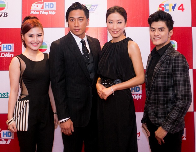 Hai người đẹp cùng chụp hình lưu niệm với hai diễn viên TVB nổi tiếng. |
