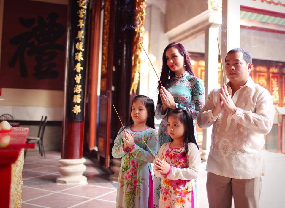Vợ chồng Thúy Hạnh - Minh Khang lần đầu tiên cho hai cô con gái đi lễ chùa cầu may mắn đầu năm.