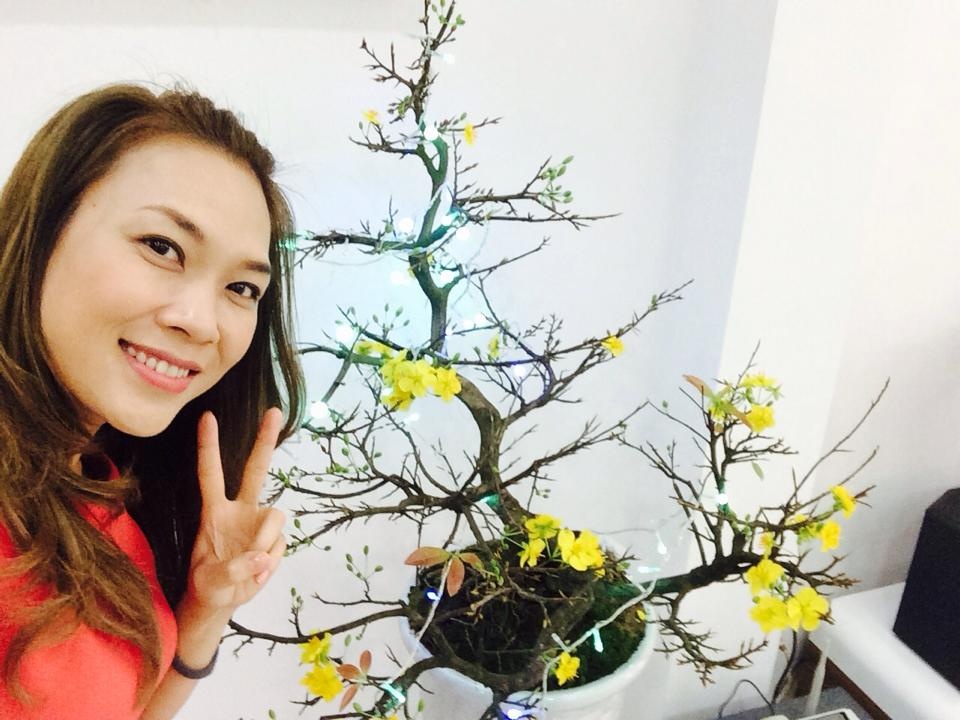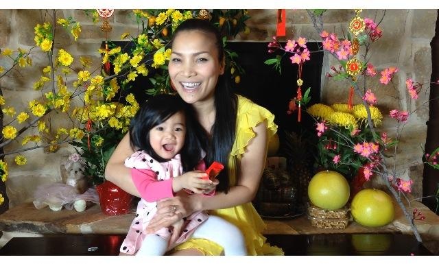 | Dù ở Mỹ, nhưng Hồng Ngọc vẫn có đầy đủ nhánh mai, cành đào, bánh chưng, bánh tét và mâm ngũ quả chưng trong nhà. Cô cũng lì xì cho cô con gái nhỏ để làm quen với tục lệ truyền thống của Việt Nam. |