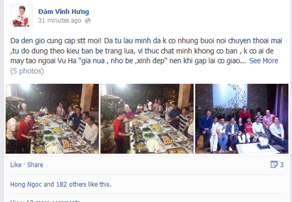 | "Gặp lại nhau, nói chuyện mày tao thật đã. Đứa nào cũng hỏi cả trăm câu, đứa nào cũng tranh kể những chiến tích của mình lúc bé rồi dắt theo vợ chồng con cái... Có đứa thì vẫn còn "nguyên" y chang mình. Có mấy tiếng đồng hồ mà sao thấy trong lòng vui lắm. Lúc đó không còn là ca sĩ Đàm Vĩnh Hưng nữa mà chỉ là một Huỳnh Minh Hưng của những ngày xưa..." - nam ca sĩ chia sẻ thêm. |