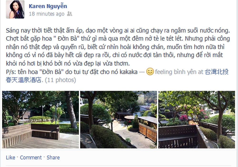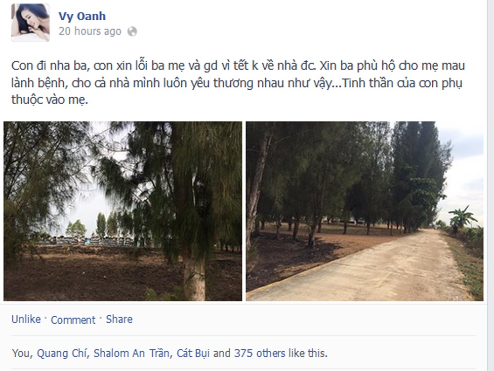 | Vy Oanh không giấu được nỗi buồn khi không thể ở quê ăn Tết cùng cả gia đình. Nữ ca sĩ Đồng xanh đã về quê ăn Tết sớm cùng gia đình. Chiều 28 Tết, nữ ca sĩ lại trở về TP.HCM. Chia sẻ những hình ảnh quê mình, Vy Oanh viết: "Con đi nha ba, con xin lỗi ba mẹ và gia đình vì Tết không về nhà được. Xin ba phù hộ cho mẹ mau lành bệnh, cho cả nhà mình luôn yêu thương nhau như vậy...Tinh thần của con phụ thuộc vào mẹ". |