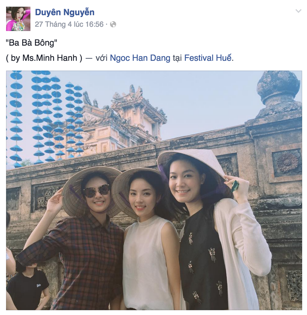 Hoa hậu Kỳ Duyên "đọ dáng" với hai đàn chị là Thùy Dung và Ngọc Hân khi cùng tham gia festival ở Huế. Cả ba người đẹp cùng khoe nét đẹp dịu dàng với chiếc nón lá. |