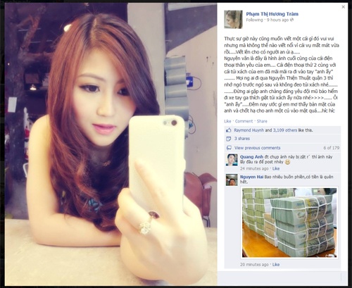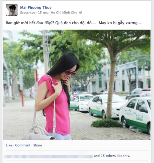 Chia sẻ lên trang cá nhân, Hương Tràm buồn bã viết: "Nguyên văn đây là hình ảnh cuối cùng của cái điện thoại thân yêu của em. Mọi người ai đi qua Nguyễn Thiện Thuật - quận 3 (TP.HCM) thì nhớ ngó trước ngó sau và không đeo túi xách nhé. Đừng ai gặp anh chàng đáng yêu đội mũ bảo hiểm đi xe tay ga thích giật túi xách ấy nữa nhé".