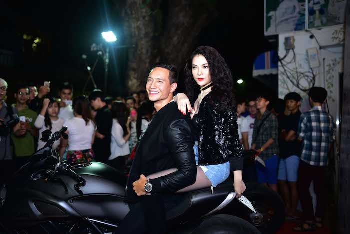 | Nữ diễn viên Đồng tiền xương máu và người tình Kim Lý tạo dáng bên mô tô khủng trước ánh mắt thích thú và tò mò của người hâm mộ trong đêm nhạc. |