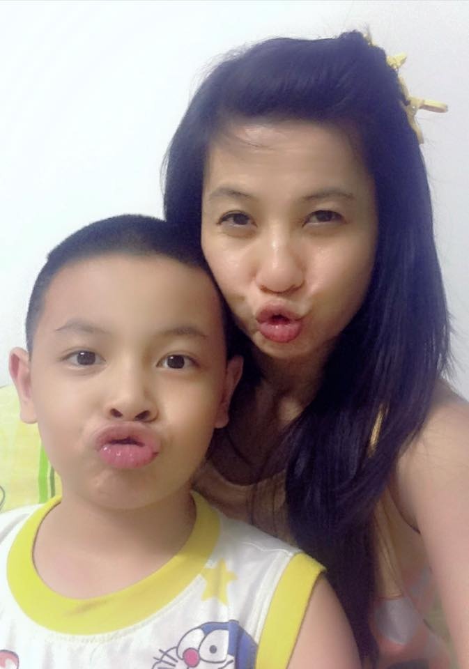 | Bước ra ngoài sân khấu Cát Phượng bình dị bên con trai. |