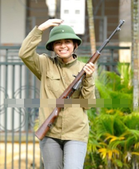 | Cô sinh viên Hoàng Thùy Linh trong khóa học quân sự. |