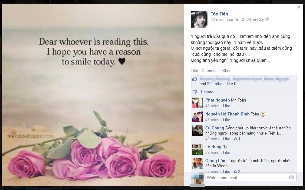Chung tâm trạng với nữ ca sĩ trẻ, Jason Việt Tiến - top 5 Vietnam Idol 2014 - bộc bạch: "Mới biết và không thể tin. Em không quá quan tâm nhiều về vlog nhưng những gì anh làm cho giới trẻ qua những vlog của mình là điều đáng trân trọng. Yên nghỉ anh nhé".