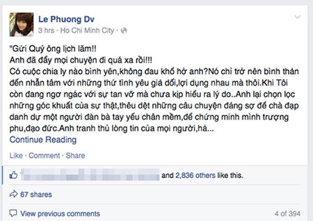 Dù không chính thức nói ra tên nhưng mọi người vẫn hiểu Lê Phương đang chỉ trích chồng cũ của mình. Nhiều người hâm mộ, cư dân mạng đã an ủi, động viên nữ diễn viên này nỗ lực vượt qua khó khăn trong cuộc sống.