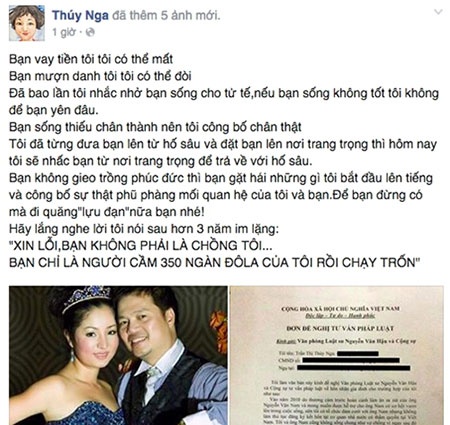 “Định mệnh của số phận đã cho tôi và bạn được gặp nhau như một cơn lốc và đi nhanh như một cơn bão. Trên báo giới, chúng ta đã từng công bố những hình cưới thật đẹp và lãng mạn của một đôi vợ chồng hạnh phúc nhưng thực tế tôi và bạn chẳng có được một ngày nào sống chung cho đúng nghĩa vợ chồng. Thực là chua chát để đến một ngày tôi phải công bố tất cả những điều này, tôi chẳng muốn vậy đâu! Mọi chuyện càng lúc càng quá tệ, cách sống của bạn hoen ố quá, nó làm ảnh hưởng đến cuộc sống và tâm hồn tôi nên những gì cần nói thì phải nói ra bạn ạ!” – Thuý Nga viết trên facebook.