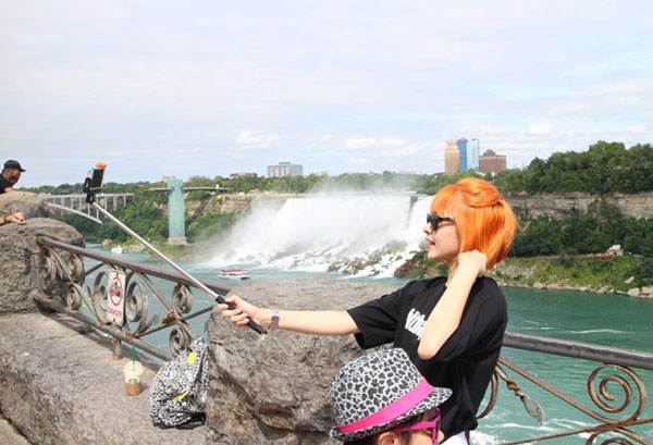 | Chi Pu đầu tư một cây gậy selfie để tự chụp ảnh mình trong chuyến du lịch. Cô nổi bật với mái tóc nhuộm cam sành điệu. |