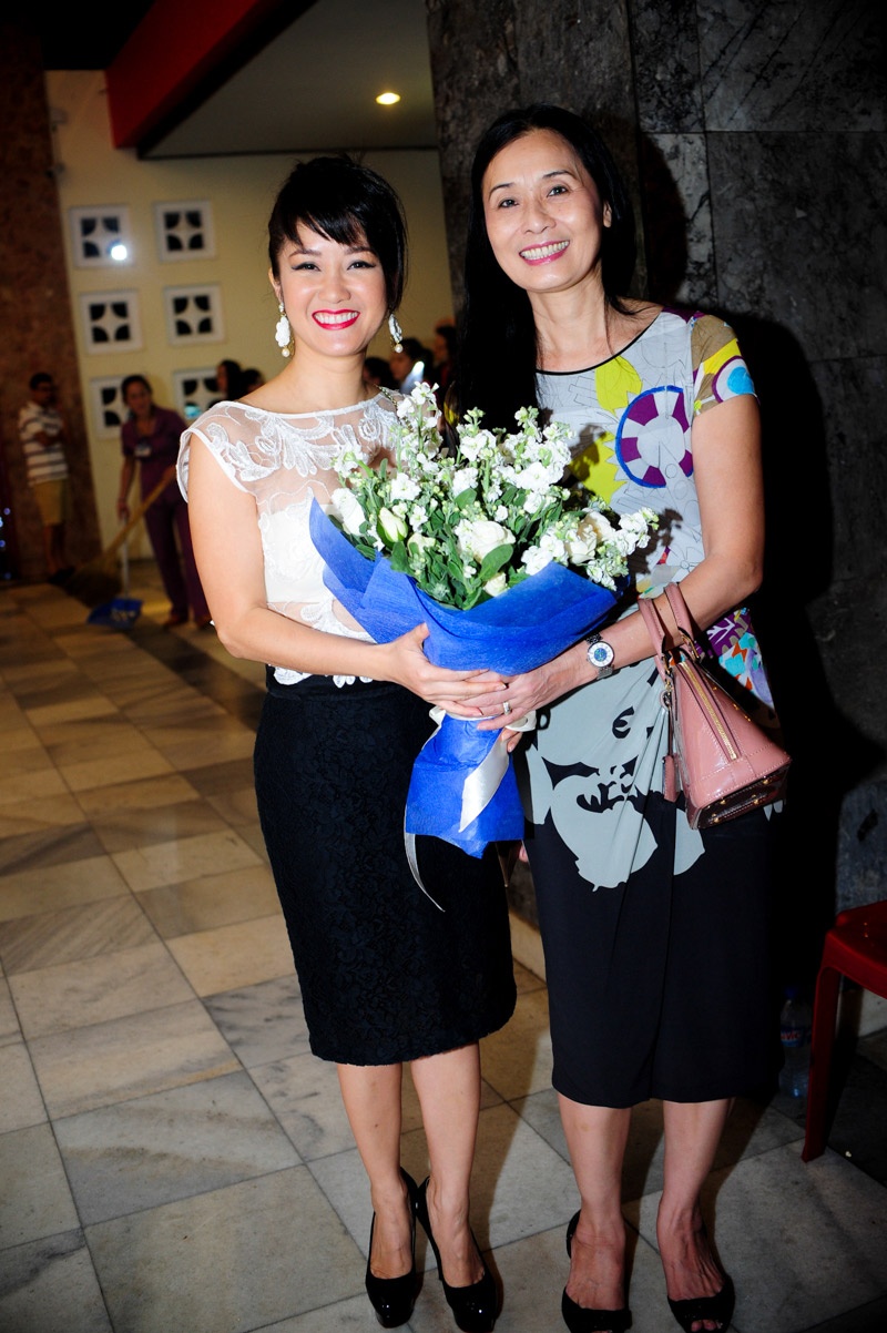 | Hồng Nhung cũng là một trong những người bạn cùng thời với Thu Phương ở những thập niên 90. Họ đều là những ca sĩ được đào tạo bài bản và được khán giả yêu mến bởi giọng ca thiên bẩm. Tối qua, nữ ca sĩ 2 con mặc khá sexy với chiếc áo ren, cô mang hoa đến chúc mừng Thu Phương. |